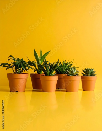© Shousei, Obraz premium ミニマルに切り取られた観葉植物の鉢と葉がくすみイエロー背景に映え、ユニークな視点で魅せる構図