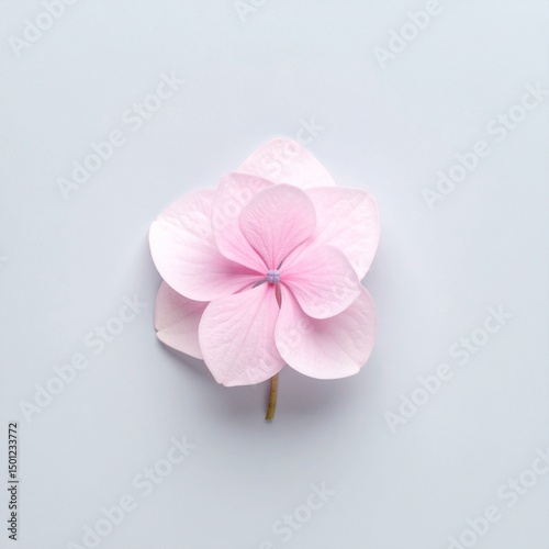 Obraz premium 青みグレーのマット背景にピンクのアジサイ一輪が置かれ、柔らかい光が花びらを照らし静かで柔らかな時間が流れる一枚