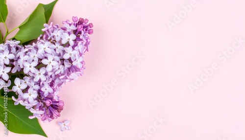 Fototapeta premium マット質感の落ち着いた背景に淡紫色のライラックがひっそりと置かれ、自然な色のグラデーションと葉の緑が調和した洗練された上品な雰囲気。