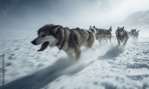 Naklejka premium 눈보라 속 질주하는 알래스칸 말라뮤트 썰매견 팀