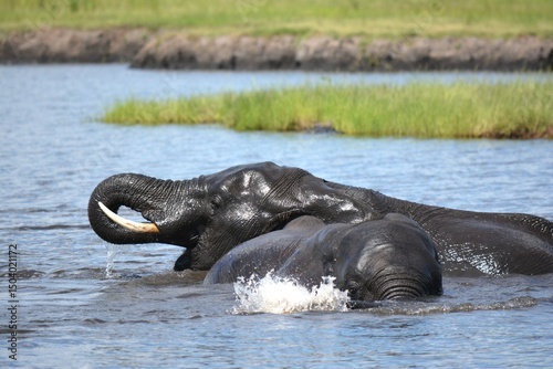 Fototapeta premium 水辺で戯れるアフリカゾウ