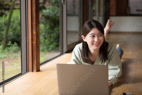 © kapinon, Naklejka premium 和風の古民家の縁側で寝転がってパソコンをする女性 田舎でのリモートワークや地方移住のイメージ