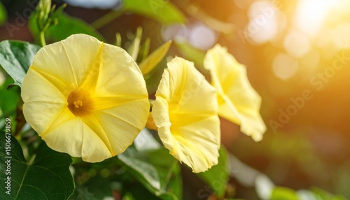 © Shousei, Fototapeta premium レモンイエローの朝顔が自然にぼかされた背景に柔らかく咲き、幻想的で穏やかな朝の雰囲気を繊細に表現している