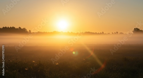 © AnilaStudio, Naklejka premium 霧のかかった野原に昇る朝日と黄金色の光