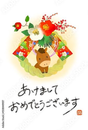 © みずたにいぬ, Naklejka premium 年賀状 2026 午年 馬としめ縄のかわいい年賀状