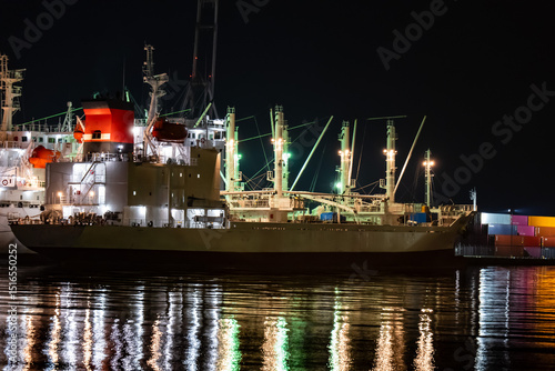Obraz premium 夜の港と停泊中の貨物船