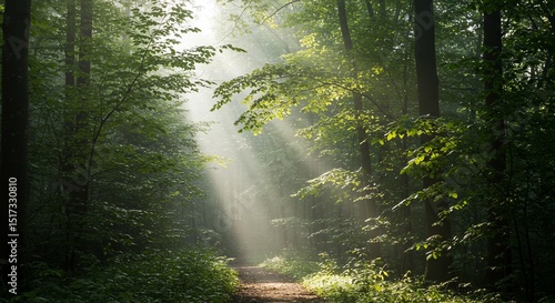 Obraz premium 神秘的緑の森道 朝の光差し込む 幻想的風景