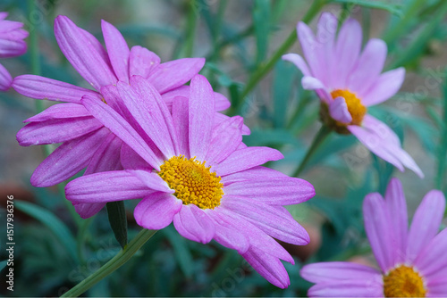Fototapeta premium 玄関の前に置かれた素焼きの植木鉢に、ピンク色の美しいマーガレットが咲き誇っている風景