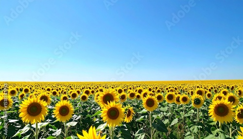 Obraz premium 一面に咲くひまわりが太陽に向かって伸びる広大な夏の野原と爽やかな青空の景色