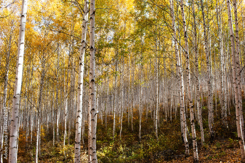 Fototapeta premium 가을 분위기의 잎이 노란 자작나무.