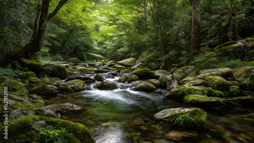 Obraz premium 清流と新緑に包まれる日本の山林