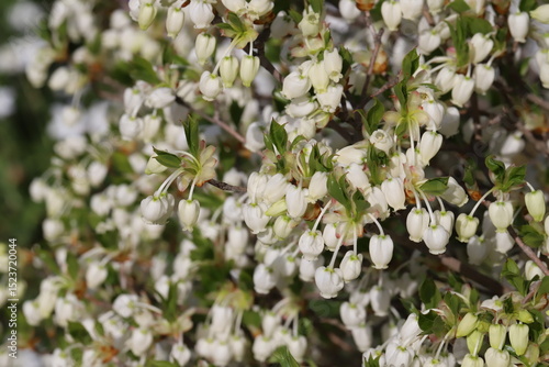 Naklejka premium 日本の春の庭に咲く白い小さなドウダンツツジの花