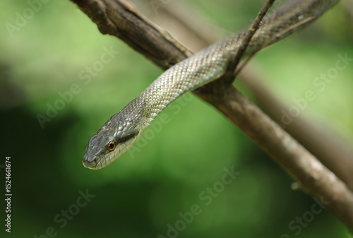 Obraz premium 樹上から見下ろすアオダイショウヘビの頭部ポートレート(自然環境下マクロ撮影)