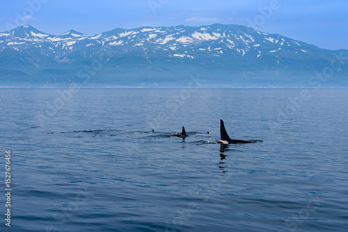 Obraz premium シャチと知床連。根室海峡の野生のシャチの群れ、6月の羅臼からのネイチャークルーズで撮影。