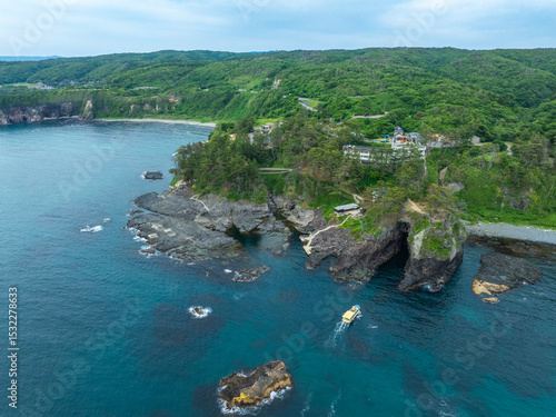 © SoraShi, Obraz premium 石川県能登半島の名所・巌門にある自然の海蝕洞に、遊覧船が進入する様子をドローンで撮影。断崖と日本海の荒波が生んだ壮大な地形を捉えた空撮写真。