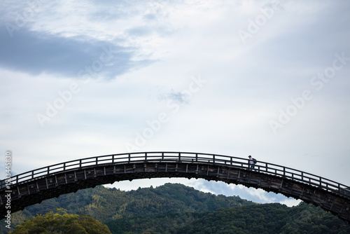 Obraz premium 空中に架かる木造橋を渡る旅人 / 山口県岩国市錦帯橋