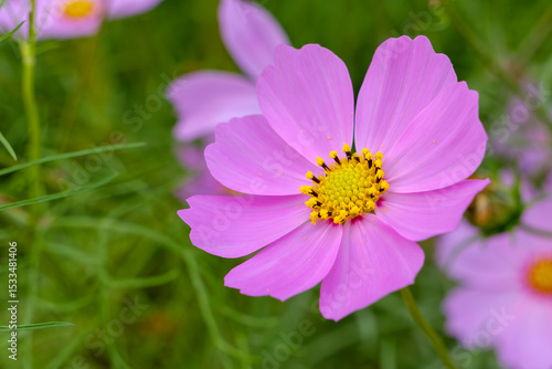 © Kazutaka, Obraz premium 一輪のピンクのコスモスと緑の背景