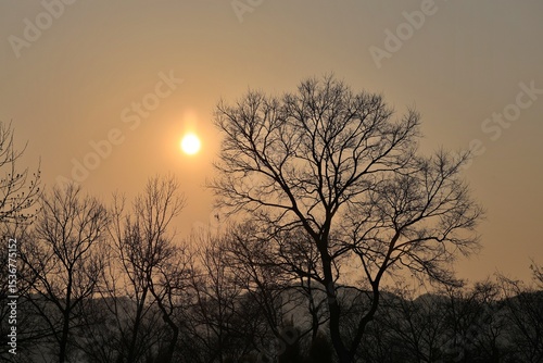 Naklejka premium 석양과 나무, 실루엣