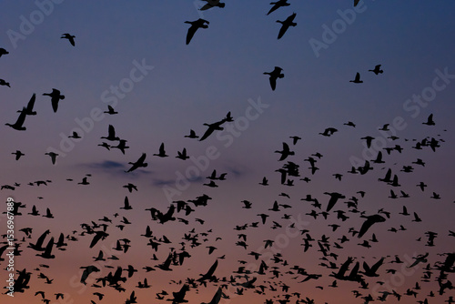 © ibuki, Fototapeta premium 夕暮れの宮島沼を飛び立つマガンの群れ(美唄・北海道)