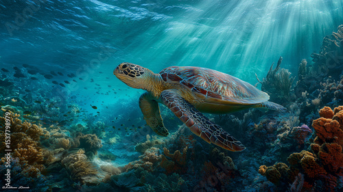 Obraz premium 絢爛なサンゴ礁を泳ぐ緑亀の肖像