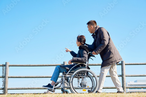 © siro46, Obraz premium 妻が乗る車椅子を押して散歩する夫
