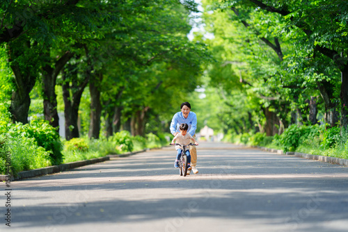 © folyphoto, Obraz premium 両親と自転車の練習をする5歳の少年