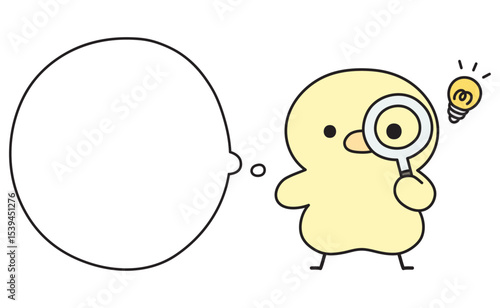 Obraz premium 虫眼鏡を覗いて何かを閃く可愛いひよこと吹き出しのイラスト