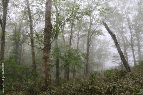 Obraz premium 霧の中の白樺牧場。赤城山にある牧場、現在は牧場は廃業し前橋市の管理となっている。自生するツツジが咲く季節には普段立ち入り禁止となっている場所のツツジを鑑賞する自生するツツジが咲く季節にはがツアーが組まれる。霧の森