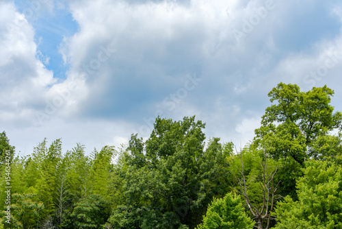 Obraz premium 曇り空と夏の緑が広がる森林風景