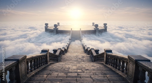 © ThanhLuan, Fototapeta premium 구름위 신비로운 계단 아침햇살 가득 평화로운 풍경
