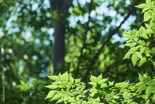 © Tokuyiro, Fototapeta premium 初夏の太陽の光を浴びて輝く緑の葉とキラキラ光る背景