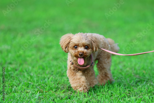 © ぬいぐるみ王国, Fototapeta premium 新緑の芝生の公園を散歩しているトイ・プードル