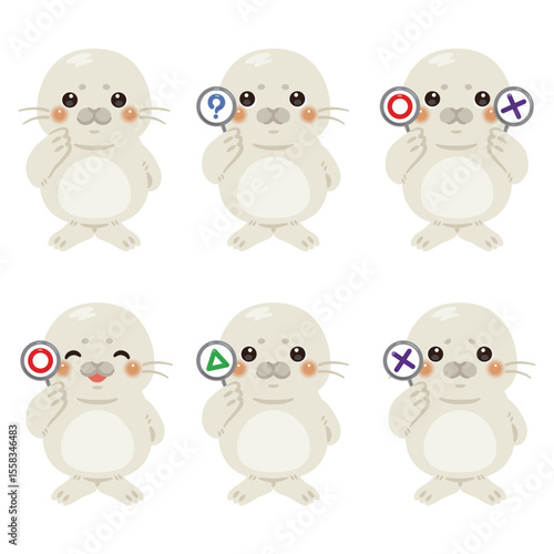 Obraz premium ○×△の札を持った赤ちゃんアザラシのキャラクターイラストセット