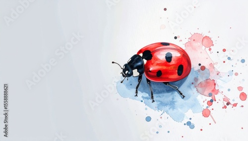 Obraz premium 落ち着いたライトグレーのマット背景の右下隅に、鮮やかな赤のてんとう虫を水彩で描いたミニマルで清潔感あるイラスト