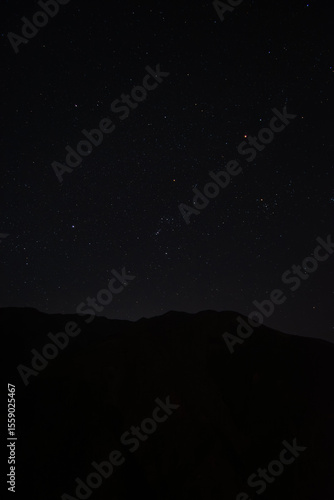 Fototapeta premium 埼玉県秩父市の山の稜線と冬の星空を捉えた風景。澄んだ空に輝くオリオン座が印象的で、静寂な自然美を感じる一枚。星空観察、天体、自然風景、旅行のイメージに最適な写真素材です。