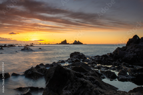 Fototapeta premium 神奈川県真鶴町の名勝・真鶴岬三ツ石に昇る朝日。オレンジ色の朝焼けと波打つ岩礁海岸が幻想的な絶景を創出。冬の澄んだ空気と静寂に包まれた神秘的な景色は、旅行・...