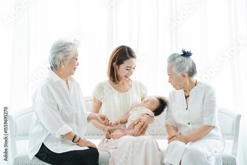 Obraz premium 赤ちゃんを抱っこするお母さんと2人のシニア女性