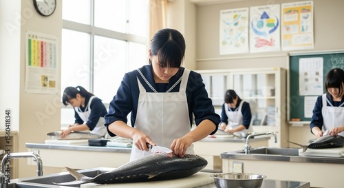 © Stingray_Japan, Fototapeta premium マグロをさばく少女