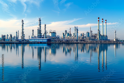 Naklejka premium 夕暮れの海沿いに佇むエネルギー工場と静かな水辺