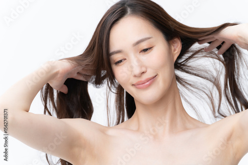 © dimlight, Fototapeta premium 白バックでスキンケアをする若い女性