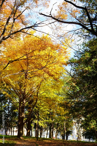 © リリ, Fototapeta premium 秋の公園で美しく黄金色に色づいた紅葉の木々と青空の風景