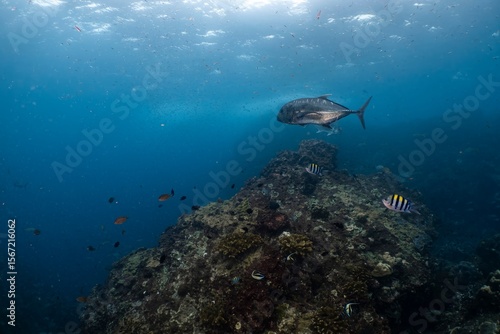 © youngdae, Fototapeta premium 바다의 거대한 트레발리와 작은 물고기들이 바위 주변을 헤엄치는 아름다운 수중 풍경