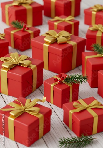 © ThanhLuan, Obraz premium 빨강 골드 리본 선물 상자 따뜻한 조명 아래 아름답게 배열
