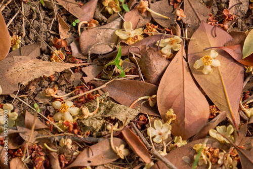 Fototapeta premium 地面に落ちた白と黄色の花と落ち葉の背景素材