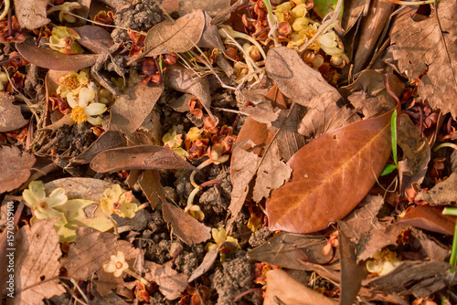 Fototapeta premium 地面に落ちた白と黄色の花と落ち葉の背景素材