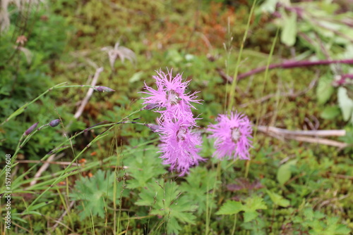 Obraz premium 白馬 小遠見山の風景。白馬五竜高山植物園。タカネナデシコ。