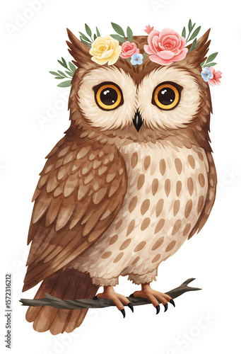 © Heini, Naklejka premium 可愛いフクロウ 花冠 穏やか 水彩画風イラスト