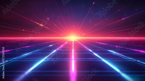 © wajigen, Obraz premium 未来的なシンセウェーブの夕焼けグリッド風景、鮮やかなネオンライトと星空