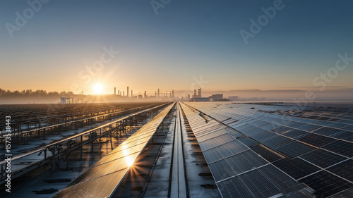 Fototapeta premium 朝日に照らされるソーラーパネルが並ぶ工場屋上風景