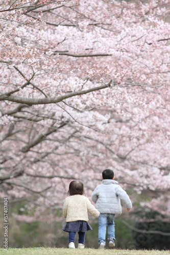 © ziggy, Fototapeta premium 桜と兄妹(6歳と1歳)